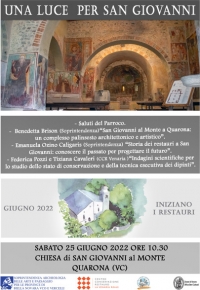 La conferenza sarà dedicata alla presentazione al pubblico del progetto di restauro degli affreschi di San Giovanni al Monte promosso dalla parrocchia di Quarona e nello specifico delle indagini diagnostiche preliminari, funzionali alla redazione del progetto, condotte dal CCR la Venaria Reale, grazie a un finanziamento del Ministero (Segretariato regionale per il Piemonte) su proposta e sotto la direzione lavori della Soprintendenza di Novara.