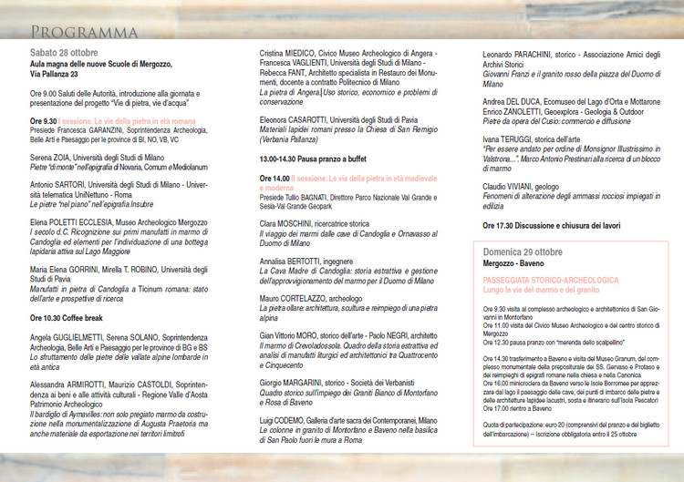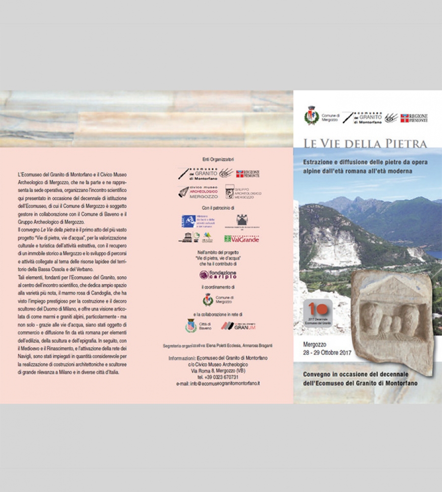 L’Ecomuseo del Granito di Montorfano e il Civico Museo Archeologico di Mergozzo, che ne fa parte e ne rappresenta la sede operativa, organizzano in occasione del decennale di istituzione dell’Ecomuseo, di cui il Comune di Mergozzo è soggetto gestore in collaborazione con il Comune di Baveno e il Gruppo Archeologico di Mergozzo, un Convegno scientifico sul tema dell’attività estrattiva e della diffusione delle pietre alpine dall’antichità fino all’età moderna, con il patrocinio e la collaborazione scientifica della Soprintendenza Archeologia, Belle Arti e Paesaggio per le Province di Biella, Novara, Verbano Cusio Ossola e Vercelli, del Parco Nazionale Val Grande, del Sesia-Val Grande Geopark e del Museo della Veneranda Fabbrica del Duomo di Milano.